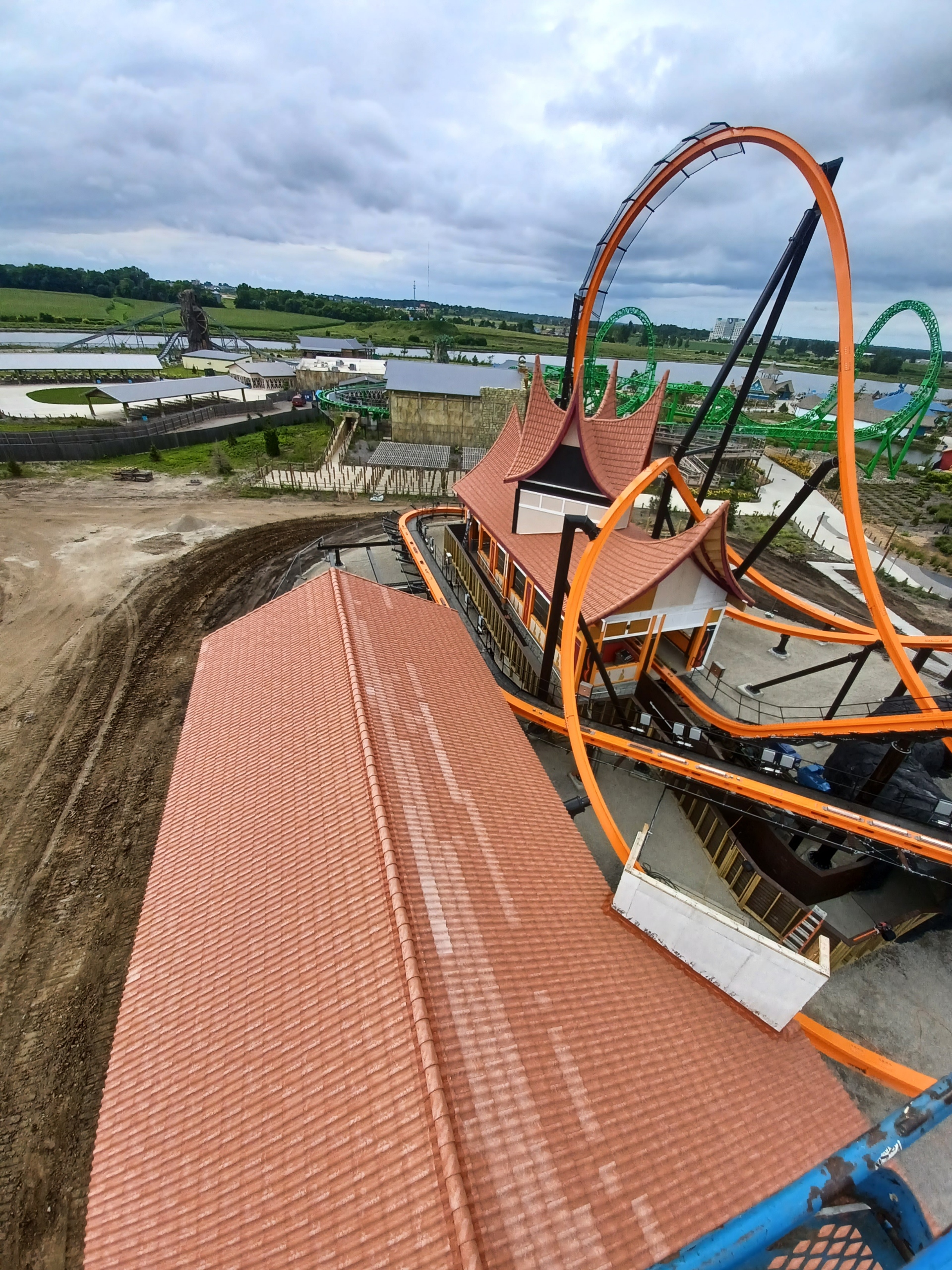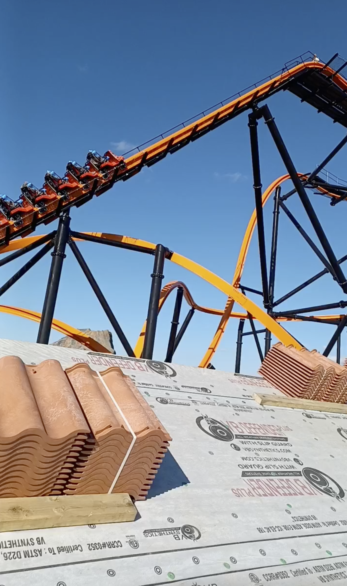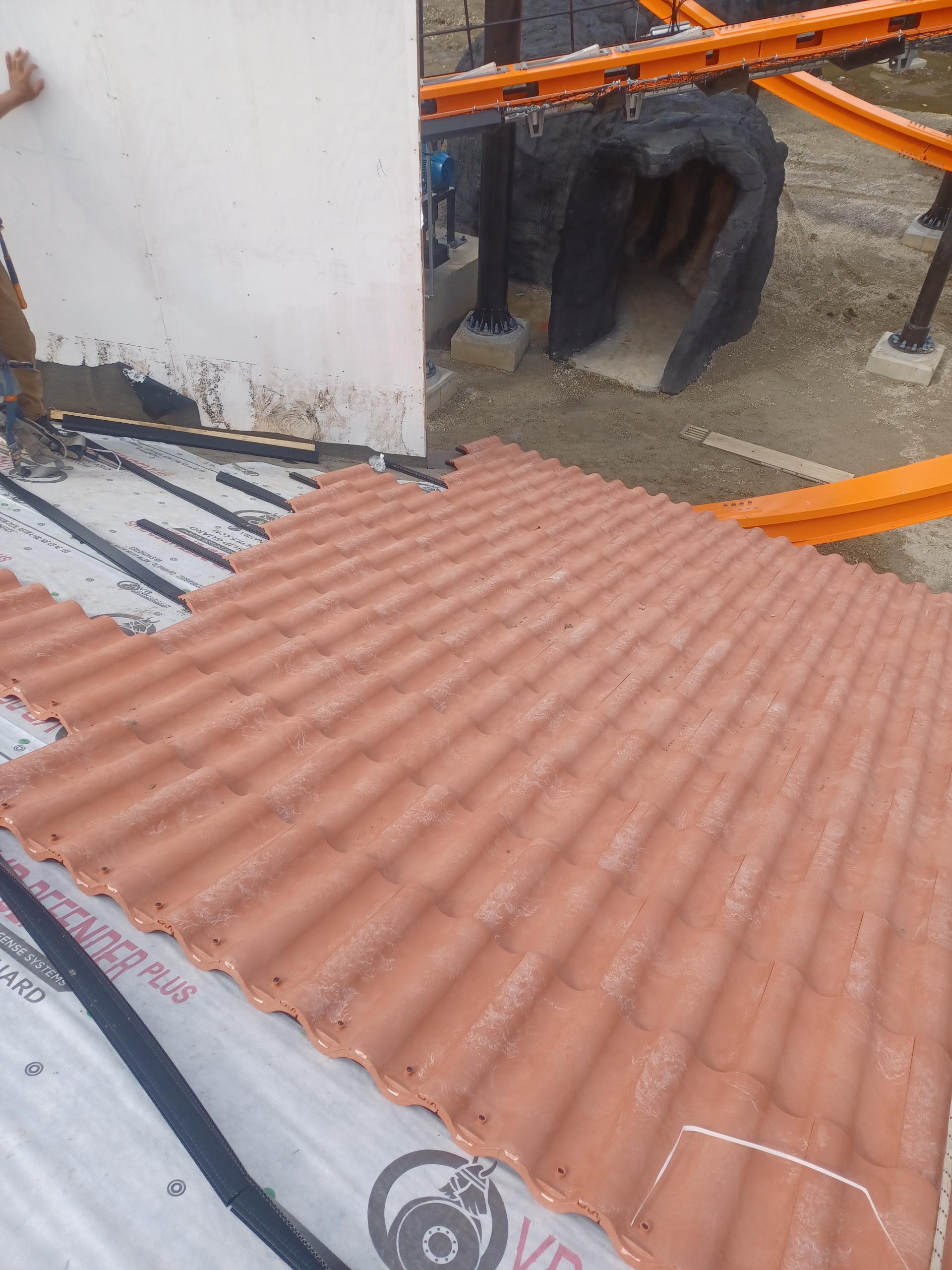 Roof installation for Fire Runner the ride at the Lost Island Theme Park at Waterloo, IA. Summer 2025.
