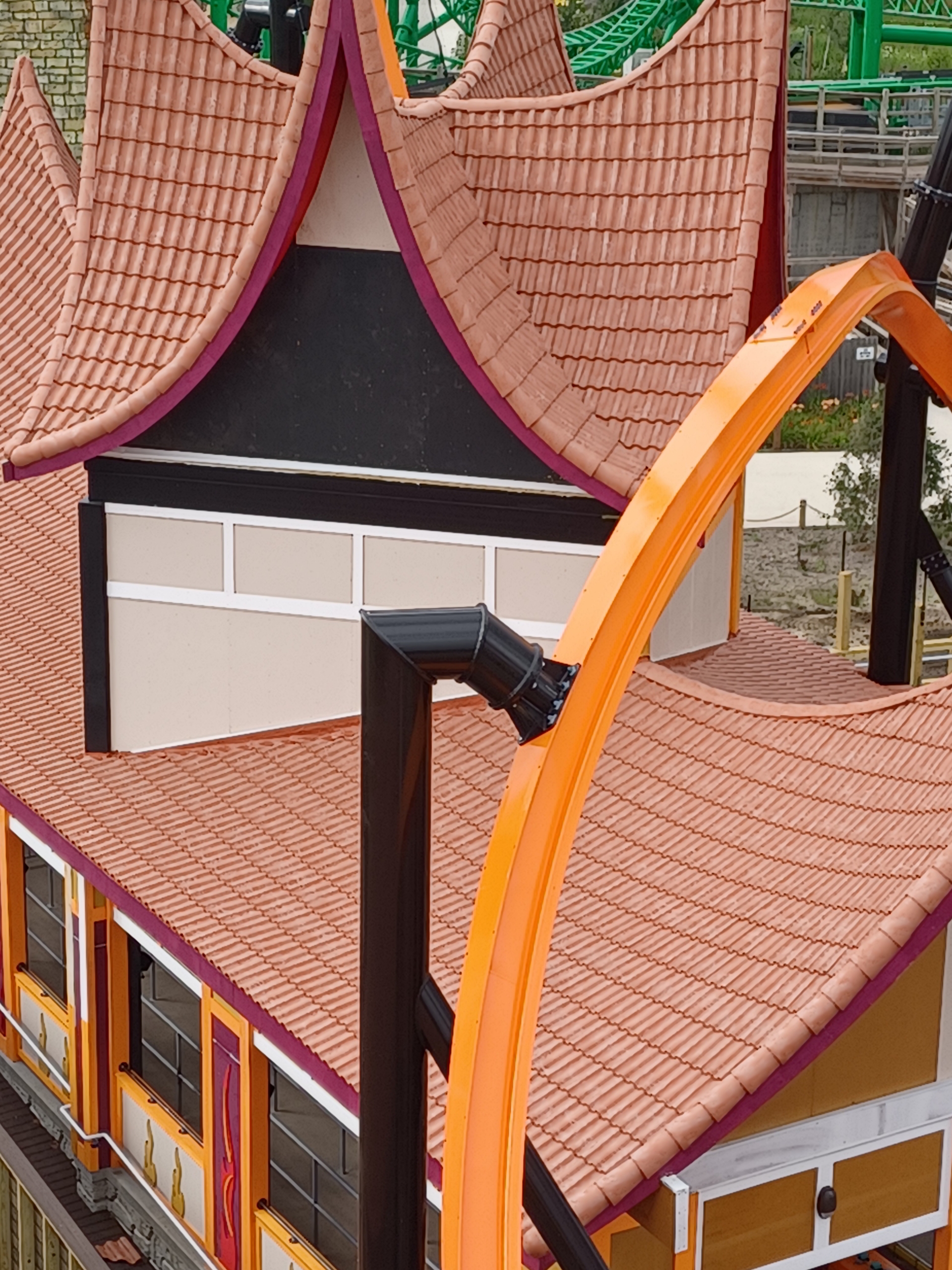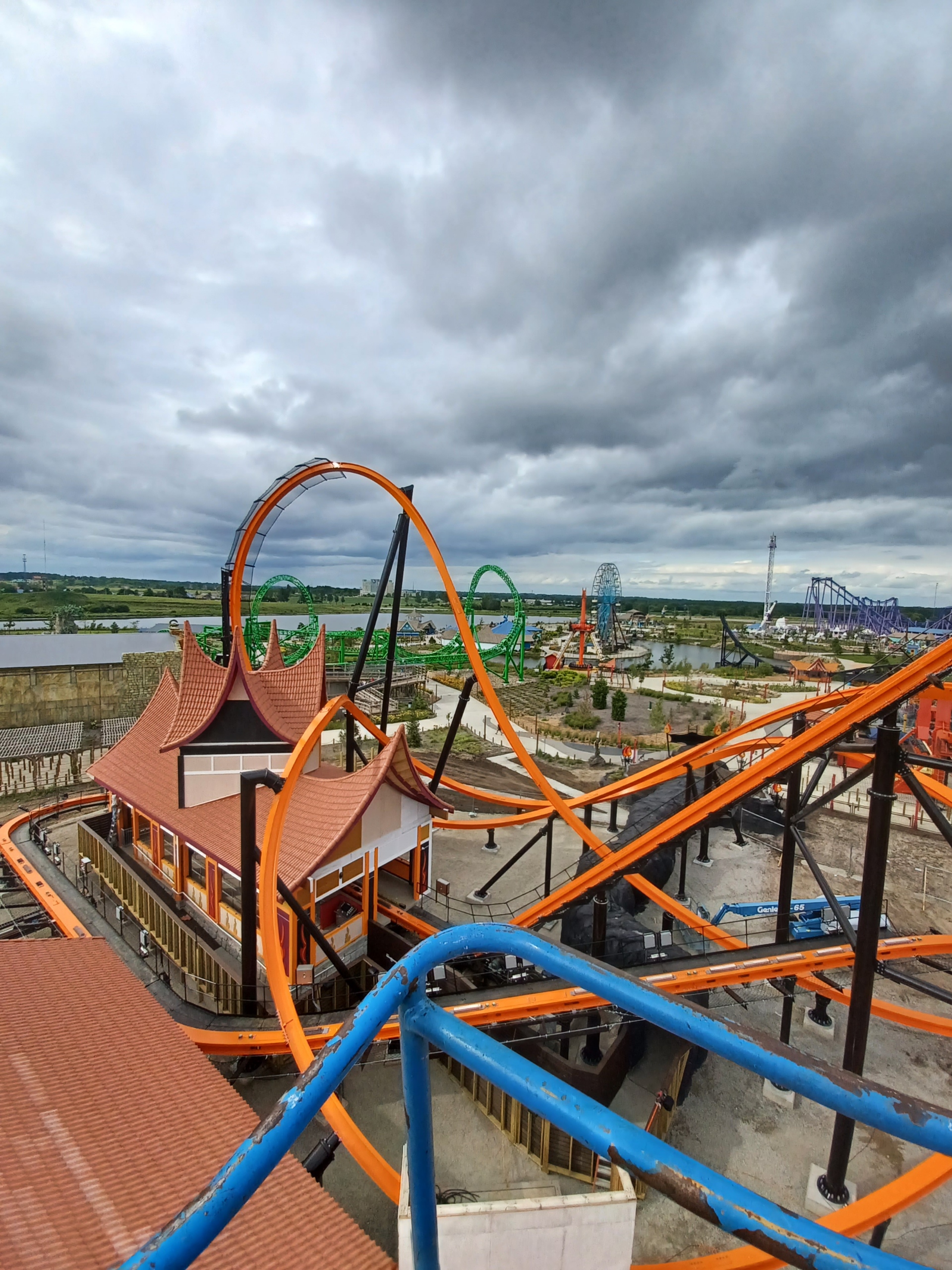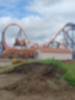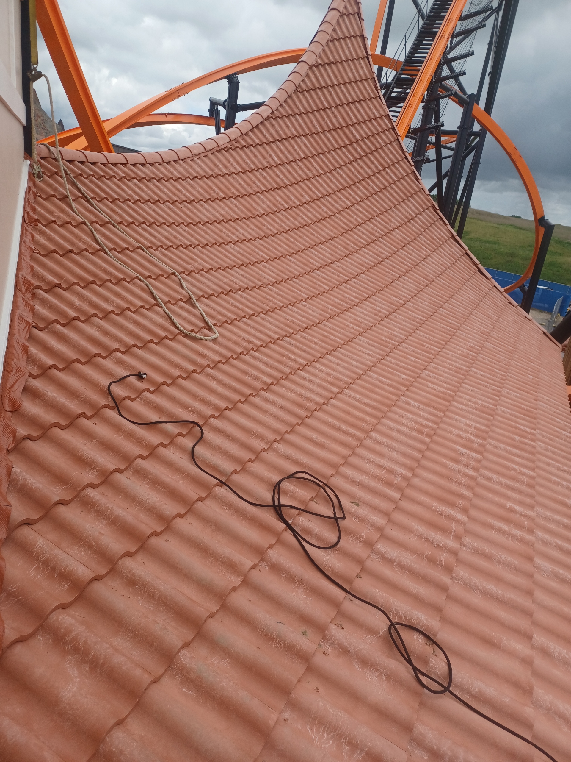Roof installation for Fire Runner the ride at the Lost Island Theme Park at Waterloo, IA. Summer 2025.